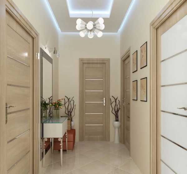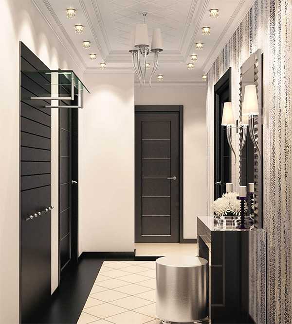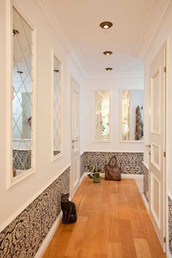 Второй, внутренний уровень потолка, обязательно должен быть глянцевым. Так, свет будет отражаться от его поверхности, создавая еще большее ощущение пространства. Просмотрев приведенные ниже фото дизайна узкого коридора в квартире, вы приятно удивитесь многообразию возможных решений.