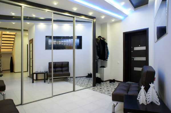 Натяжные или навесные потолочные конструкции с вмонтированной подсветкой сделают вашу прихожую интересней и светлее. В конструкции можно использовать зеркальные элементы.
