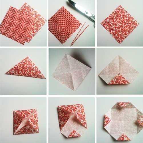 Нам понадобится цветной тонкий картон для творчества, клей, ножницы и схема-инструкция для сборки. Из прямоугольного листа картона нужно сделать квадрат. Провести диагонали и наметить точку их пересечения. Каждый угол квадрата сложить к точке и наметить линию сгиба. Далее по схеме наметить все остальные линии сгиба. У нас получается лист с намеченными квадратиками. Внимательно по схеме делаем надрезы по углам квадрата, складываем и склеиваем стороны коробки. Чтобы сделать крышку повторяем тоже самое.