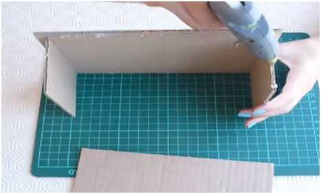 Получился периметр в периметре. Теперь на полоску сбоку нужно нанести клей и приклеить тот картон, который подойдёт по размеру. Все полоски из картона вырезались уже с просчётом, поэтому можете определять на глаз. Какая полоска по размеру подойдёт, ту и можно смело клеить. Ставим картон, прижимаем, и чтобы она не упала, нужно подставить любую коробку, которой мы выровняем угол наклона. Пусть коробка постоит и поддержит буквально минуту.
