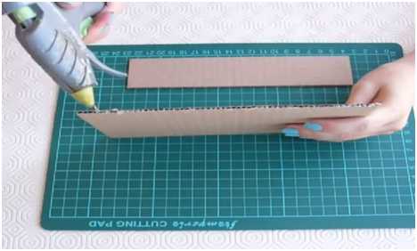 Теперь нам нужно приклеить более длинные полоски. Для этого мы наносим клей и на линию карандаша, и на боковые бортики, что получились по обеим сторонам после того, как мы приклеили первые 2 картона.