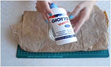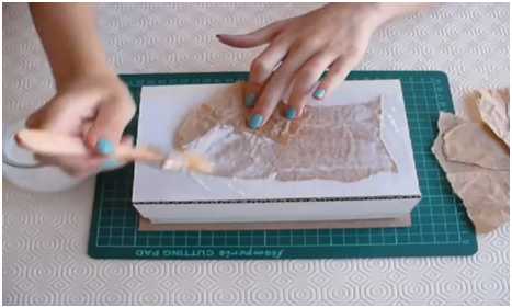 Теперь берём бумагу, которой в советские времена заворачивали в магазине развесную колбасу, рвём её на средние кусочки, и обклеиваем коробку. Для обклейки нашей коробки использовался специальный клей, который наносится поверх приклеиваемого лица, что противоречит закону сцепления, однако есть такой клей, имеющий свойство проникать через бумагу. Вы же можете использовать обычный клей и обычный метод приклеивания.