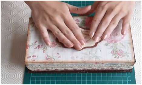 Отрезаем цветочную бумагу для декора, равную трём частям коробки, так как мы будем обклеивать боковую часть + крышку коробки + боковую часто крышки. Бумага должна быть цельной. Размер можно замерять заранее, с помощью сантиметра. На бумагу наносим бумажный, твёрдый клей и аккуратно приклеиваем от основания коробки по боковой части. До боковой части крышки как показано на рисунке.