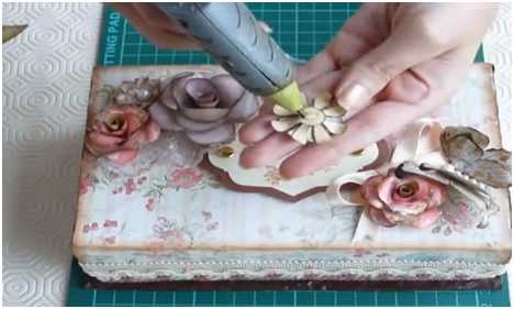А я уже не буду комментировать, чем декорирована наша коробка, поэтому предлагаю вам досмотреть поэтапные фотографии моего декора. Скажу лишь, что розочки и бабочки были сделаны отдельно, из обычной бумаги. Остальное – это отвалившиеся детали от некогда красивых украшений и прочих вещей из быта.