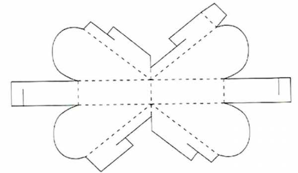 Чтобы не тратить много времени на построение чертежа, можно воспользоваться готовыми шаблонами для распечатки. Это очень удобно и разнообразен выбор. Например коробка – “Бутон розы” Необходимо вырезать и загнуть по пунктирным линиям. Красиво оформите стороны заготовки, положите во внутрь подарок и соберите лепесточки вверх.