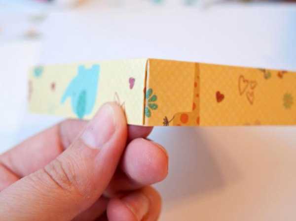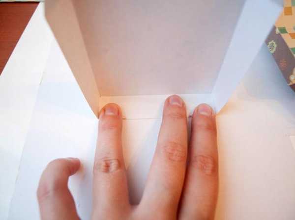 Аккуратно складываем два уголка, загибаем, прикладываемся к столу, зажимаем пальцами. Терпеливо ждем. Старайтесь намазывать ровно столько клея, сколько надо, иначе он вытечет и прилипнет к бумаге. В итоге останутся потом некрасивые отпечатки и грязь.