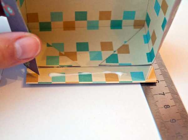 Аналогичным способом склеиваем нижнюю часть коробочки, а затем заклеиваем подвороты. Не забывайте, что клей надо равномерно размазать по всей поверхности, а излишки убрать! Вы ведь хотите красивую коробочку да?