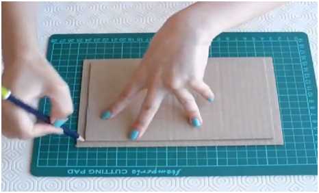 На стол кладём большой картон, который у нас был 21х14, а на него кладём картон размером 20х12. Приложить нужно в аккурат по центру, чтобы со всех сторон были одинаковые отступы по контуру. Обводим маленький картон карандашом.
