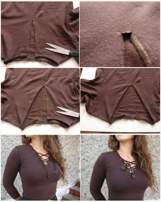 Превратите старую футболку в модный топ с завязками. Для этого нужно аккуратно отпороть рукава и отрезать нижнюю часть футболки так, как показано на картинке. Стоит отметить, что для изготовления этой вещи совершенно не понадобится умение шить, только ножницы и аккуратность.