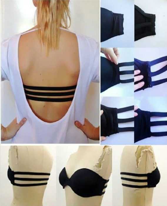 Замените спинку старого бюстгальтера на несколько эластичных резинок черного цвета. Обновленный бюстгальтер можно смело надевать под модные сейчас вещи с открытой спиной.