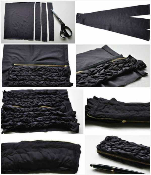 Из старых легинсов можно сделать стильный клатч. Для этого эластичный материал нужно разрезать на полоски шириною два-три сантиметра, заплести в косички, пришить к отрезу ткани нужного размера и скрепить молнией.