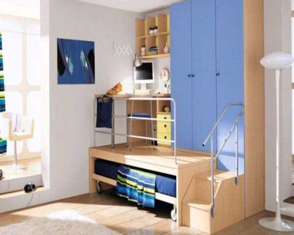 Удачным решением может стать использование двухъярусной конструкции: для спального места подойдет второй ярус, а стол с полками или стеллажом отлично впишется внизу под кроватью. Так вы сэкономите дефицитную площадь.