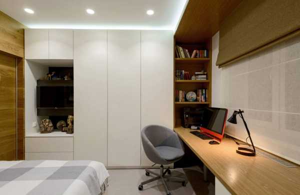 Дизайн однокомнатной квартиры родителей с подростком – школьником уже предусматривает наличие перегородки. Она может быть стационарной из гипсокартона или в исполнении ширмы. Удачным вариантом может стать установка кровати на верхнем ярусе, когда нижний отводится для рабочего места, тумбочки и шкафа. Лесенка на второй ярус может быть со встроенными ящиками для хранения вещей. Возраст ребенка подскажет момент, когда уже можно отказаться от игровой зоны в пользу увеличения рабочего пространства.