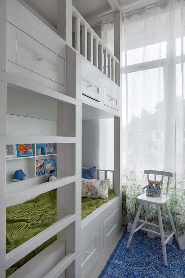 Спасительным решением станет двухъярусная кровать. Помимо двух мест для сна, конструкция может иметь выдвижные ящики. Если для обоих детей необходимы столы для занятий, присмотритесь к длинным столешницам, за которыми поместятся сразу двое. Если же они разного возраста, лучше обустроить два отдельных места.