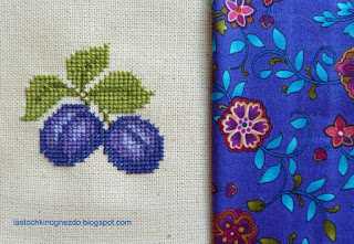 В общем, взяла двунитку, вышила сливы. Ткань сначала выбрала эту