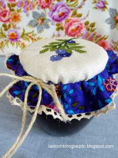 Теперь наложите «чепчик» сверху на банку (закрытую крышкой) и обвяжите ленточкой. Пусть ленточка будет того же оттенка, что и вышивка, и косая бейка – банка будет смотреться гораздо гармоничнее.