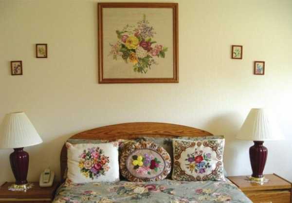 На таких стенах красиво смотрится вышивка в интерьере, оформленная в виде картин. Тематика вышивки должна подходить к обстановке комнаты. Яркие вышитые картины-натюрморты с разнообразными фруктами и овощами подойдут для кухни, а в спальне или гостиной хорошо будут смотреться разнообразные цветочные композиции.
