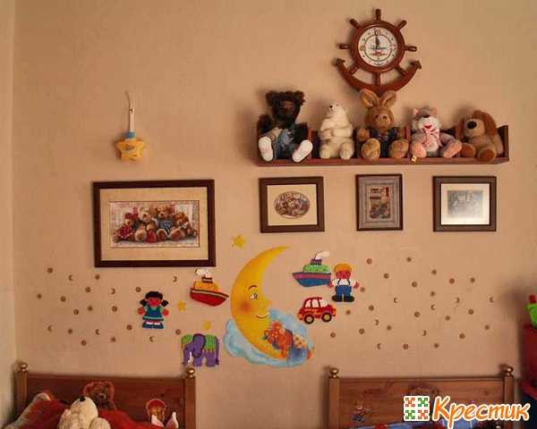 Оформление детской комнаты во многом зависит от отношению к воспитанию ребенка. Часто размещают картины и репродукции с изображением героев мультфильмов, иллюстрации к рассказам о путешествиях. Но учтите, что дети вполне способны воспринимать серьезную живопись, поэтому не стоит целиком ориентироваться на «мультяшный» стиль.