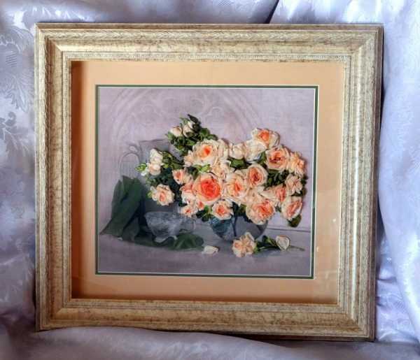 Некоторым людям нравятся такие картины без стекла, чтобы видна была объемность работы с разных сторон. Это весьма привлекательно, но подходит только в случае, если работа вышита атласными лентами или искусственного шелка, вискозы.