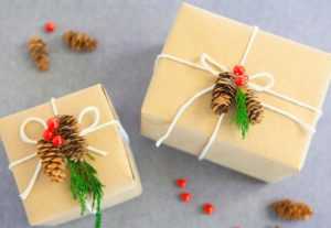 Оригинально украсить коробку можно обычными шишками. Чтобы их закрепить, используйте клей или бумажные ленточки.