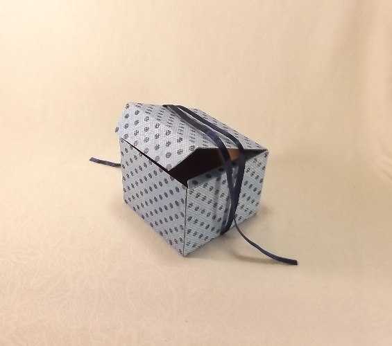 Если подарок побольше, то предлагаем вам следующий вариант картонной подарочной коробки с завязками из тесьмы: