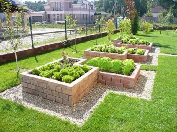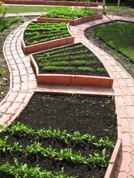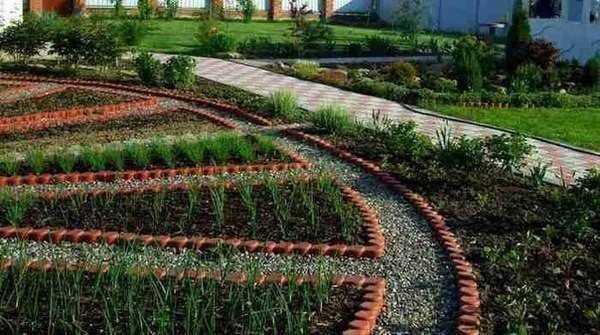 В данном примере кирпичный бордюр укреплен цементным раствором. Цвет бордюра хорошо сочетается с цветом плитки дорожек. Огород в целом организован в виде фигуры.