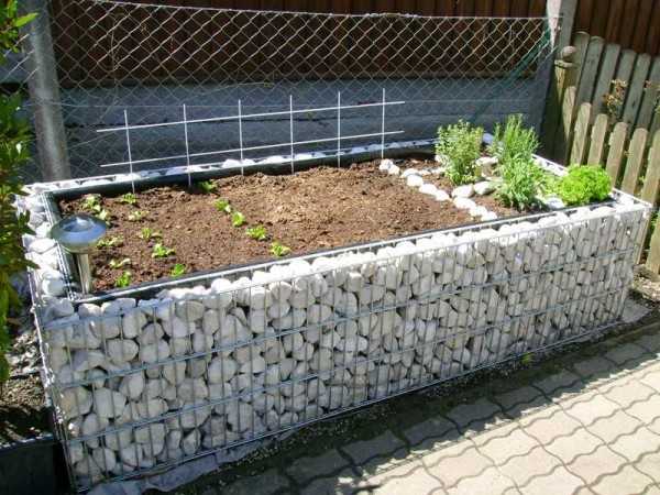 Красивые грядки своими руками люди делают в неожиданных местах и из неожиданных материалов. То, что бордюры кладут из камня, это знают многие, но для их скрепления используется бетон. А это — долго и муторно. Но если сделать ограждение из металлической сетки, а внутрь засыпать камни, получится оригинальная ограда. Она называется «габион» и в последнее время довольно популярна. Чтобы земля не высыпалась, внутреннюю часть сетки (со стороны насыпного грунта) закрывают геотекстилем.