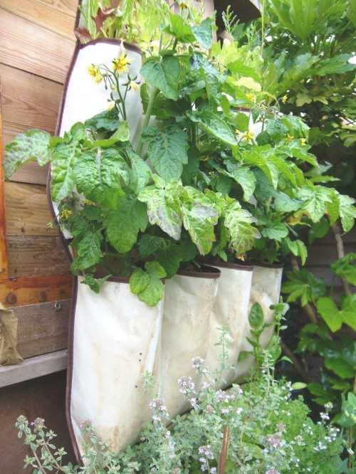 - Подвесной огород. Такое сооружение выглядит эффектно и не занимает много места. Потребуется основа – стена или несколько столбиков, а также контейнеры, в которые можно засыпать землю. В качестве таких емкостей используются пластиковые бутылки, обрезки трубы, мешочки. Далее их необходимо закрепить на стене или на столбиках, после чего можно высаживать в контейнеры растения. В таких высоких горшках хорошо растет клубника, зелень, а также небольшие овощи.