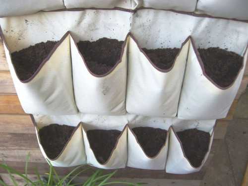 Налейте воду вкарманы, чтобыпроверить: пропускают – ли они воду. Если нет, то сделатьнесколько маленьких отверстийв каждой изкарманов. Затем засыпаем в каждый карман влагоудерживающий компост и сеем семена или высаживаем саженцы в каждый карман.
