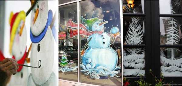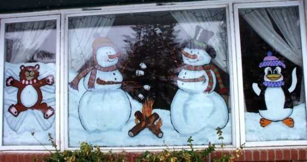 Украсить окна на Новый год можно при помощи красок. Широкая поверхность оконных стекол позволяет изображать целые сюжеты с несколькими героями на фоне новогодних пейзажей. Для рисования лучше использовать гуашь – по сравнению с другими красками она ложится на стекло плотным слоем и легко отмывается впоследствии.
