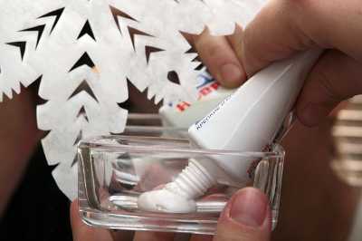 - Зубная паста. Она быстро застывает на стекле, при этом, при необходимости легко смывается водой. Ее можно наносить губкой, используя ее в неразбавленном виде, либо разбавить с водой и наносить зубной щеткой. После того как паста высохнет, можно с помощью зубочистки прорисовать любые детали.