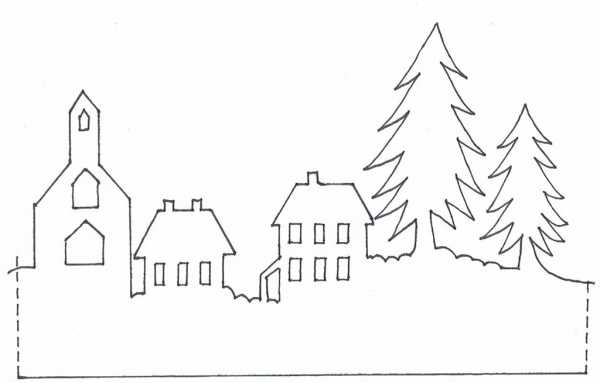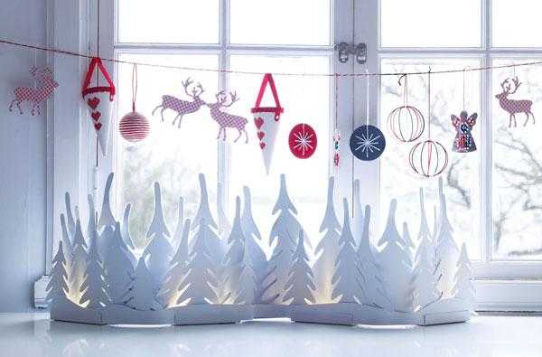 Украсить окна к Новому году можно, используя обычную белую бумагу. Нарисованные от руки трафареты или распечатанные шаблоны бумажных силуэтов нужно всего лишь вырезать и закрепить на окне (или расположить на подоконнике). Это могут быть очертания заснеженного сказочного леса или уютной крохотной деревушки с шапками снега поверх маленьких домиков.