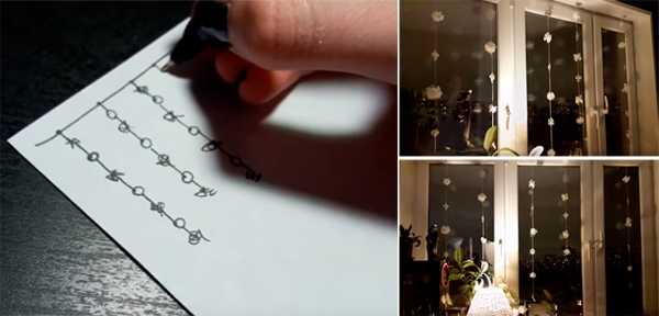 Гирлянды всегда создают праздничное настроение, поэтому их обязательно нужно использовать для украшения окон. Для этого можно использовать электрические гирлянды одного или нескольких цветов. Их можно развесить разными способами: вертикально, горизонтально, также можно сделать контур елки на окне из гирлянд или разместить гирлянды по контуру оконной рамы, но так же их можно сделать своими руками и ниже мы расскажем как.