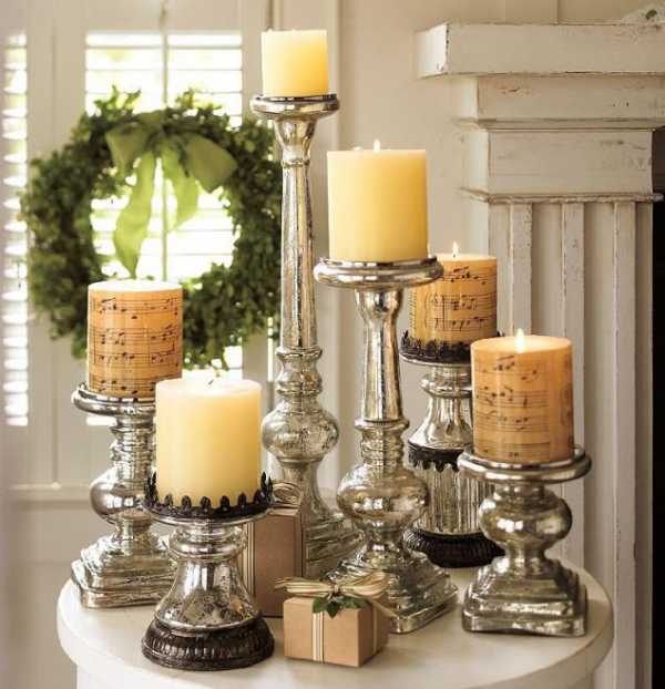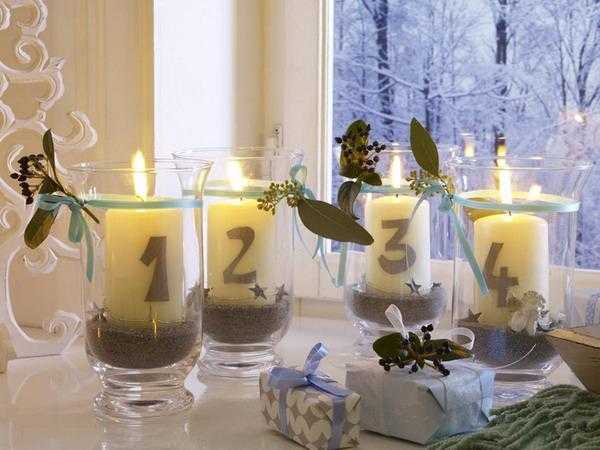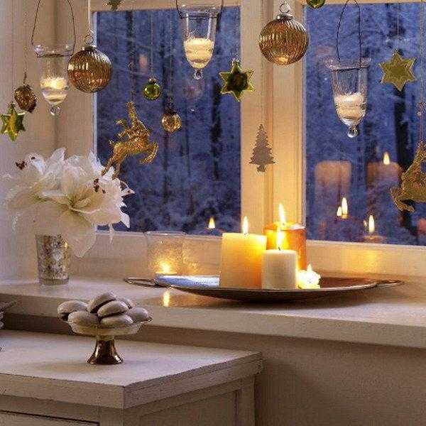 Не только украсить окна на Новый год, но и придать интерьеру оттенок романтики или даже таинственности можно с помощью зажженных свечей. Свечи могут быть одинаковыми по цвету и размеру или, напротив, различаться по форме, но составлять единую композицию в общей стилистике интерьера.