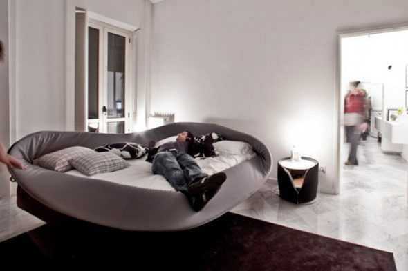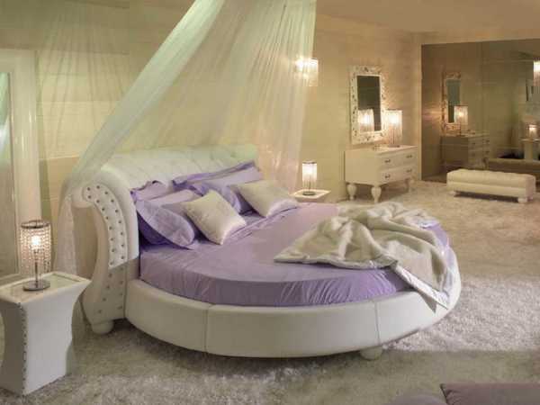 В качестве дизайнерского решения может быть выбрана не обычная прямоугольная кровать, а круглая, сердцевидная или другой причудливой формы. Покупая такую, помните о сложностях, которые вас ждут: и матрас, и постельное белье придется делать на заказ.