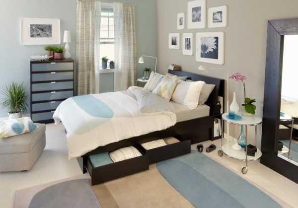 Хранение может обеспечить не только подкроватное пространство. Обратите внимание на изголовье, оно может быть более глубоким, образуя полочку сверху, и иметь выдвижные ящички. Тогда можно будет обойтись без прикроватных тумб.