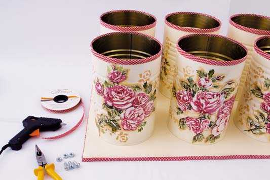 Мастерится такое изделие из пустых жестяных банок из-под детской молочной смеси в технике декупаж.