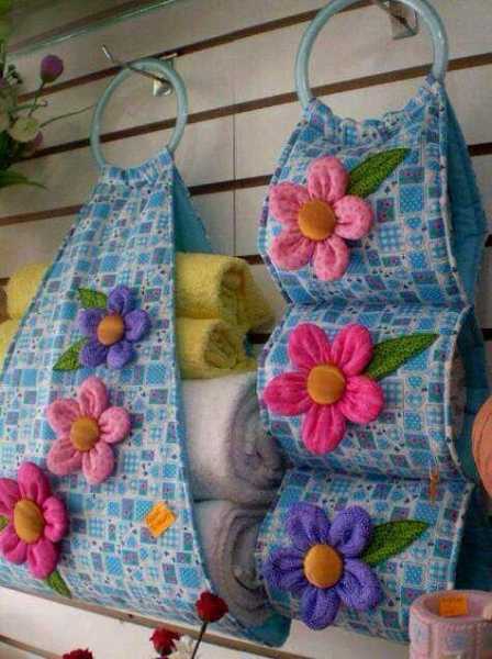 Если в доме нет маленького ребенка, то заготовить необходимое количество жестяных банок бывает крайне проблематично. Не стоит отчаиваться. Не менее нарядным и стильным получается держатель для полотенец из ткани на стену. Идея для такой поделки показана на фото.