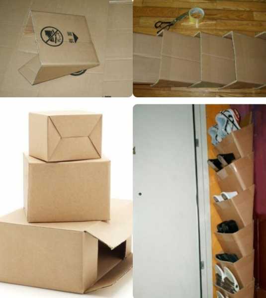 Функциональный настенный органайзер из коробок для обуви, который позволит сэкономить жилое пространство, также прост в своем исполнении. Как видно на изображении, пустую тару из-под крупногабаритной бытовой техники всего лишь необходимо согнуть в трапецевидные кульки, скрепить их скотчем и вставить друг в друга. Для придания такой навесной обувной полке более презентабельного внешнего вида, можно тонировать ее морилкой и покрыть лаком.