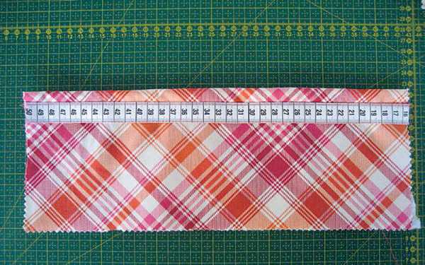 Срез по одной длинной стороне детали С отвернуть на изнаночную сторону на ширину 2 cм. С лицевой стороны наложить старую сантиметровую ленту и приколоть булавками.