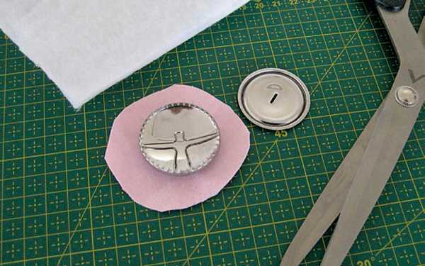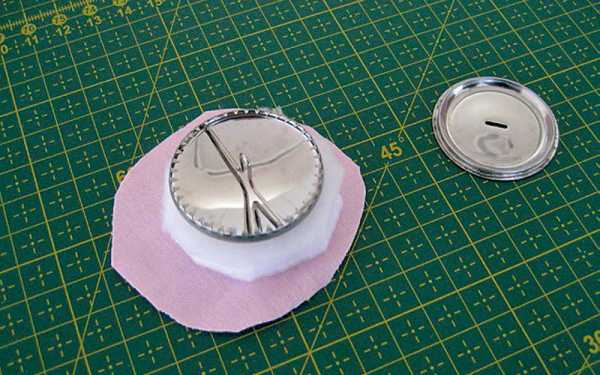 Из розовой ткани вырезать круг диаметром на ок. 1,5 см больше диаметра пуговицы для обтяжки. На ткани вышить любой мотив вручную или с помощью швейно-вышивальной машины.