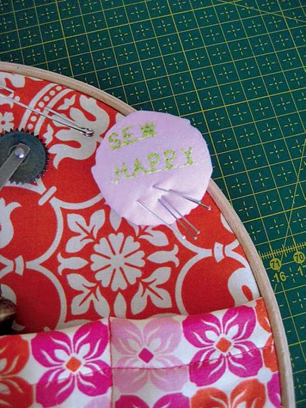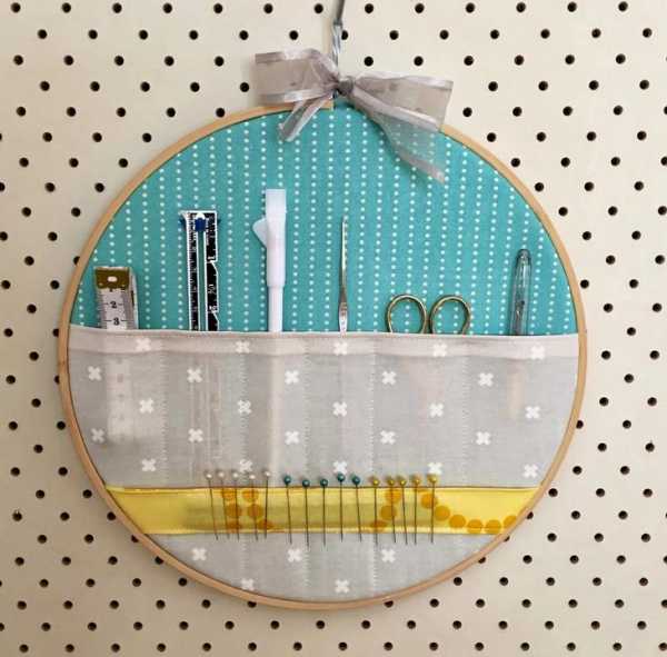 А вот ещё оригинальные карманы — настенные, натянутые на обычные пяльцы для вышивания. В такие кармашки можно положить ножницы, карандаши и другие инструменты для шитья. К тому же, это отличный элемент декора в интерьере!