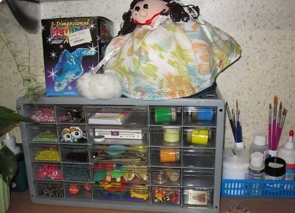 Я очень люблю делать сувениры и различные аксессуары своими руками. Как вы понимаете, у меня дома целый склад ниток, лоскутов ткани, спиц, крючков, и прочих рукодельных принадлежностей.Раньше я все это богатство хранила в ящиках стола, пакетах и коробках. Но после того, как муж в порыве эмоций пообещал выбросить все нужные мне вещи, я задумалась, как мне организовать их хранение таким образом, чтобы они были всегда под рукой, но при этом никому не мешали.
