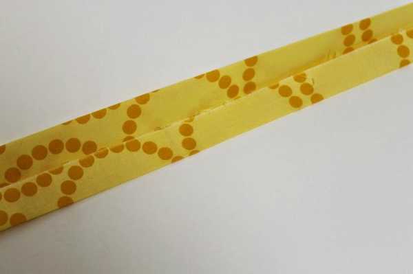 Возьмите полоску желтой ткани и сложите ее вдвое. Необработанные края заверните внутрь.