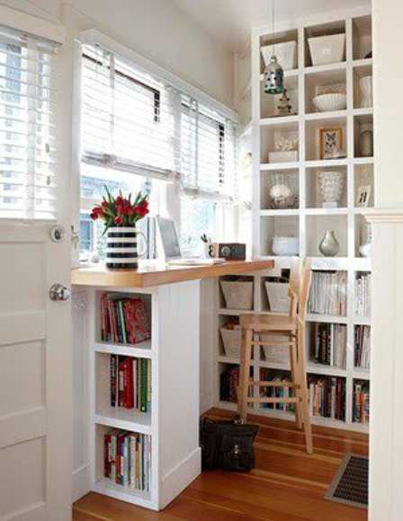 Обычные полки с откидной дверкой позволят вам рационально использовать все свободные места в квартире. Обратите внимание, дверь закрывает рабочее место от посторонних глаз.