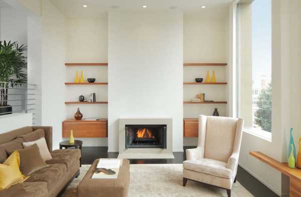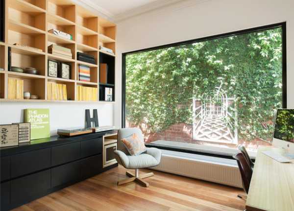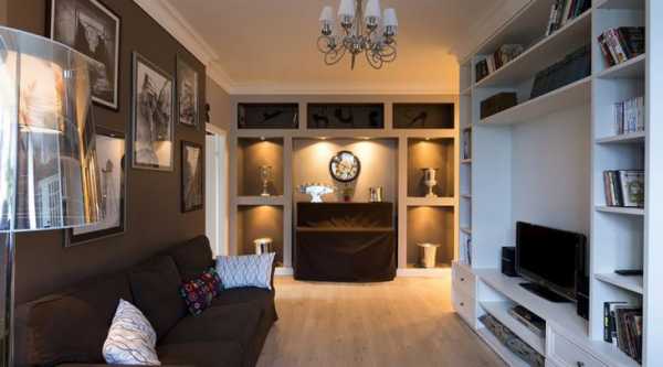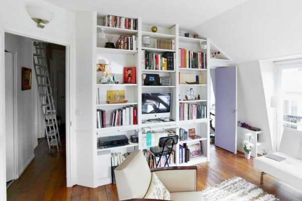 Взамен массивных книжных шкафов лучше всего применять навесные полки или стеллажи. Эффектнее смотрятся вытянутые по длине и незакрытые: это сделает визуализацию пустого пространства намного практичнее.
