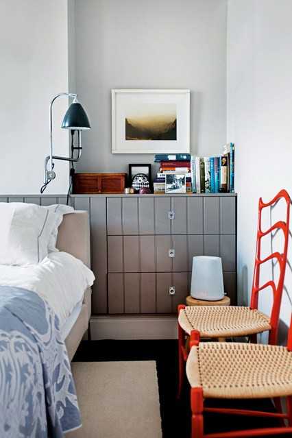 Главная спальня в доме дизайнера Пола де Зварта искусно сочетает декоративные детали и практичные решения для хранения вещей. Комод, встроенный в альков — прекрасная идея использования особенностей планировки комнаты. И комод, и облицовка стен изготовлены из одного и того же материала, а стулья служат в качестве красочного штриха.