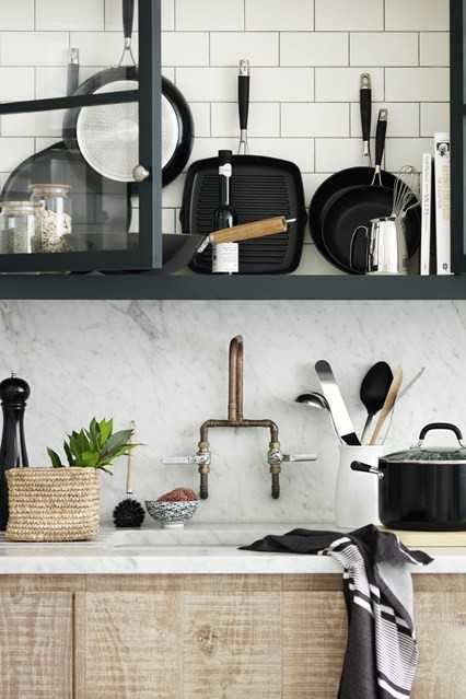 Дизайнер интерьеров Джейн Тейлор использовала множество идей для организации полезного пространства на собственной крохотной кухне — включая и этот уголок на фото, в котором полки сочетаются с крючками, позволяя разместить все нужное, не занимая много места.