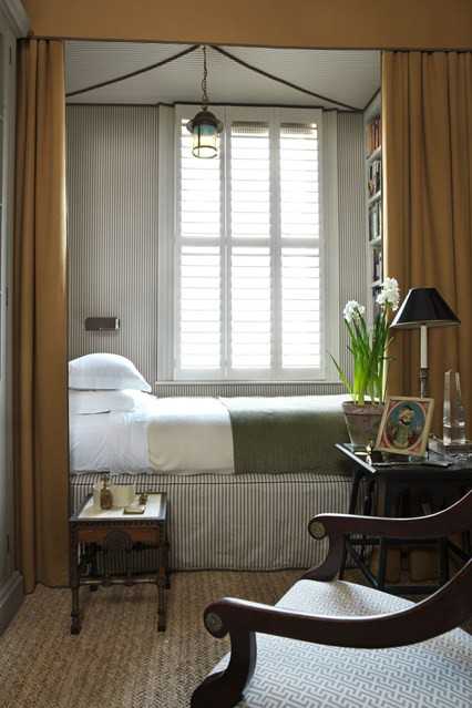 Эта истинная жемчужина оформления интерьера создана дизайнером Вире Гренней. Стены, покрытые тканью, потолок с отделкой в виде палатки кажутся роскошными и экзотичными. Книжная полка с хорошими книгами — обязательная деталь комнаты — здесь она встроена в одну из стен над подножием кровати, поскольку места для книжного шкафа в доме нет. Это самый легкий способ придать интерьеру особого характера и оживленности.