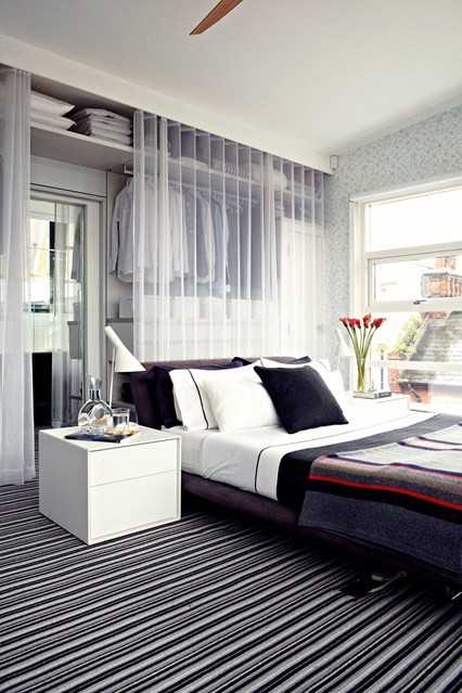 Дизайнер Маурицио Пелиццони выгодно использовал пространство за кроватью, превратив его в импровизированную гардеробную без стен. За зеркалом скрывается двойная дверь, ведущая в ванную. Между кроватью и своеобразной гардеробной есть небольшое пространство, позволяющее свободно заходить в огороженную шторой зону, которая также оснащена выдвижной лестницей. Благодаря хитроумным деталям интерьер комнаты кажется более светлым и совсем не перегруженным.